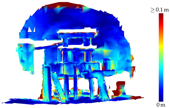 Accuracy of the HoloLens triangle mesh of the three-dimensional scene depicted in Figure 5 evaluated against TLS ground truth data.