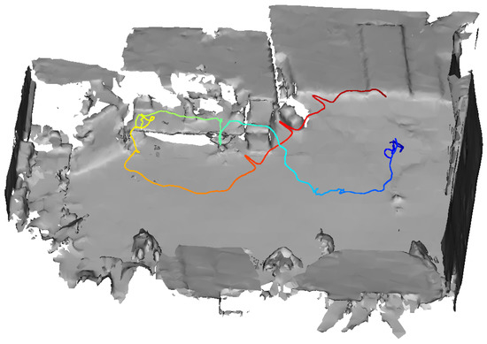 HoloLens trajectory in a room equipped with a Motion Capture System. The color represents time. The trajectory starts at blue and ends at red. The evaluation results in Figure 14 also refer to this trajectory. They are visualized in the same color range representing time.