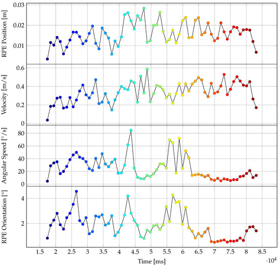 One of the evaluated trajectories of the rigid body on the device as tracked by the HoloLens tracking system is depicted in Figure 13. This trajectory was recorded with non-covered range sensor. Figure 14 shows the associated velocity and RPE values over the course of the trajectory. The color range in both figures symbolizes time, going from blue to red.