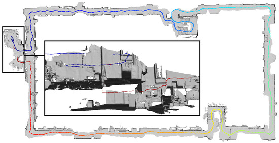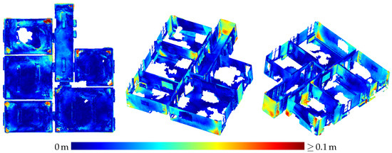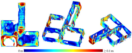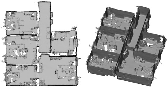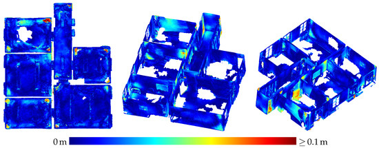 Contrary to the large displacements of adjacent rooms reported by Hübner et al. [13], no displacements of such a magnitude were noticed in the indoor triangle mesh presented in Section 3.3. Only the wall between the upper and middle room on the left-hand side in Figure 16 shows a slight narrowing towards the room corners which could also be caused by multi-path effects as is probably the case with the outward bulging of ceilings in room corners visible as red spots in some room corners in the top view visualizations in Figure 17 and Figure 18.