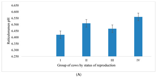 Analysis of the reticulorumen pH of cows by reproductive status showed the highest average value of this indicator in Group IV (Figure 1A), which was 2.13% higher compared to Group I, 0.76% higher compared to Group II, and 1.37% higher compared to Group III. According to multiple comparisons of means, all differences between the groups of cows by reproductive status were found to be statistically significant (p < 0.05).