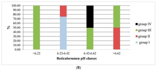 We found (Figure 1B) that all pregnant cows (Group IV, n = 20) belonged to the third class according to their reticulorumen pH, which ranged between 6.42 to 6.62 (50.00% of the animals in this class were Group III cows).