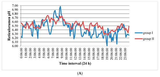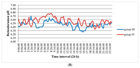 The data in Figure 2A show that the pH of the first group (15–30 days postpartum) changed from 6 to 6.98 during the day. The range of changes in this indicator was 2–2.24 times higher compared to cows in the other groups.