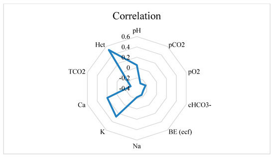 Reticulorumen pH was statistically reliable and positively correlated with blood K (p < 0.01) and Hct (p < 0.001), while it was negatively correlated with pCO2 and TCO2 (p < 0.01) as well as with pO2, cHCO3-, BE (ecf), and Na (p < 0.05). Data are presented in Figure 5.