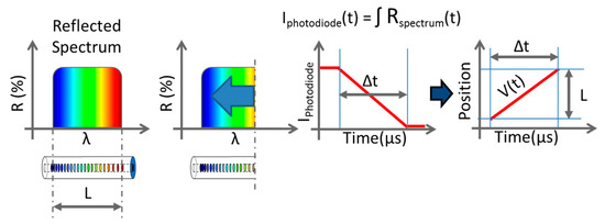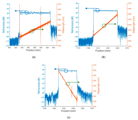 The CFBG response can be obtained from the reflected spectrum in the BraggFast system. Indeed, one wavelength corresponds to one position along the CFBG, and, since the CR is constant, the relation is linear by design. When a CFBG is shortened, the reflected spectrum of the remaining part of the CFBG does not change significantly, as shown in Figure 6a. Then, all spectral distortions are multiplied in the wavelength domain and can be measured from the CFBG reflected spectrum with a calibrated OSA. In our system, 10% of the reflected spectrum was sampled (see Figure 3). The spectral distortions of the 90:10 coupler were measured individually and taken into account in our signal processing tool. The BraggFast system measured the amplitude of the reflected spectrum, and this was also the integral of the spectral density as a function of the wavelength. If the CFBG is shortened, the end of the CFBG corresponds to a wavelength. The normalized CFBG response in the wavelength domain can be written as in Equation (1).