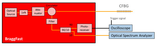 The BraggFast is the CFBG interrogation system for detonation velocity measurements. The block diagram of the system is depicted in Figure 3. The common optical source is an ASE or a super-luminescent diode (SLED). Depending on the number of measurement channels, the source is split and the following list of optoelectronic parts is duplicated. The maximum optical power sent to a CFBG is limited to 10 mW; thus, the laser system remains in Class 1. A circulator routes the reflected signal from the CFBG to a coupler with a 90%–10% ratio. Most of the power (90%) is collected by the fast photoreceiver with a bandwidth higher than 250 MHz, while 10% is routed to a standard optical spectrum analyzer (OSA) to measure the initial optical spectrum. An attenuator is used to adjust, if needed, the photoreceiver signal levels in the same range just below saturation when different types of CFBG are used. The photoreceiver is connected to a real-time oscilloscope, which is triggered by the igniter of the detonator. The OSA is used for only a few minutes before the experiments; the calibration procedure is presented in Section 4.