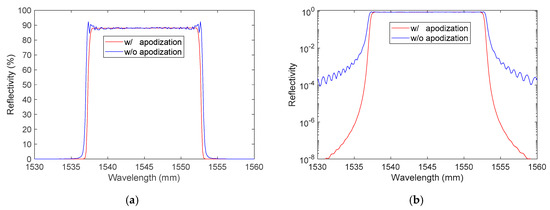 The simulated optical spectra with and without apodization (sinusoidal shape), in linear and logarithmic scale, are plotted in Figure 4a,b. The following characteristics were obtained without apodization: