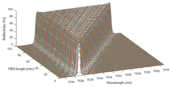The shortening of the CFBG, as happens during detonation, was then simulated in 200 steps. All the simulated spectra for a 100-mm-long CFBG without apodization are plotted in Figure 5. The spectral width seemed very linear with the length of the CFBG. It is interesting to look at the beginning and the end of this process. The spectra are replotted with a 5-nm span in Figure 6a,b respectively centered on 1552.5 nm and 1537.5 nm. When the shortening process started, since the CFBG was not apodized, the reduction of the optical bandwidth was immediate, as if the edge was just shifted. The phenomenon was different at the end of the shortening process. When the CFBG started to be less than 1.5 mm, the maximum reflectivity was not reached, and the optical spectrum was even broadened. The decrease in the reflected amplitude was less likely to be linear.