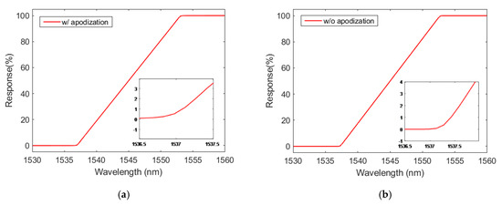 CFBG response (in %) as a function of the wavelength by integrating the initial spectrum: (a) design with apodization; (b) design without apodization.
