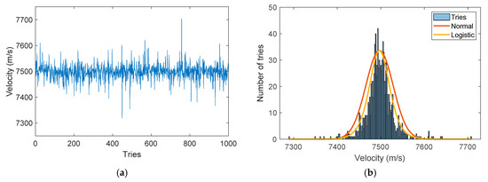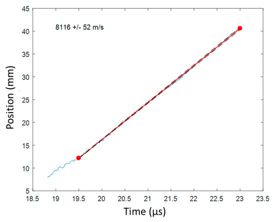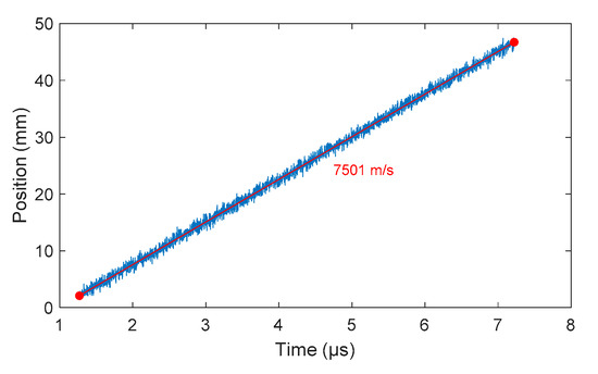 Once the CFBG response was calculated and the BraggFast signal was smoothed and normalized, the two curves could be compared to obtain the X–T diagram. For each point of the BraggFast signal between the upper and lower bounds (0.05–0.95), the time value was kept and the ordinate was interpolated on the CFBG response to obtain the corresponding position. To perform/carry out this interpolation, the abscissa and the ordinate axes were switched in the numerical function. The results of all these interpolations are plotted in Figure 19 as a function of the BraggFast time signal. In order to obtain the detonation velocity, a fit of the slope was performed using a standard least mean square method. The fitting slope is plotted in red in the same figure. Despite the high level of noise in the BraggFast signal and the optical spectrum, the detonation velocity value obtained, 7501 m/s, was very close to the input parameter given. The standard deviations are discussed below.