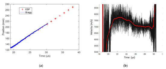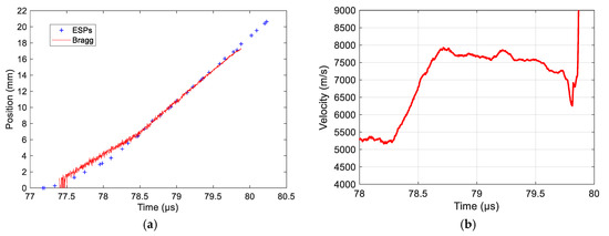 The CFBG CR value was measured by reflectometry to be 0.1854 nm/mm (± 0.64%) assuming that the optical effective index (neff) did not change. The CFBG response calculated from the reference optical spectrum and the CR is plotted in Figure 36a. The measured BraggFast signal is shown in Figure 36b. The X–T diagram is shown in Figure 37. The steady detonation velocity calculated between 19.5 and 23 µs was (8116 ± 52) m/s. The steady detonation velocity measured on the HE surface by 10 ESPs was (8061 ± 121) m/s, which was 0.9% lower. The two values overlapped in their respective boundaries, which were, however, larger than in the bare cylinder stick experiments presented in Section 6.1. It would be interesting to repeat these cast-cured bare cylinder experiments with improved accuracy in the chirp measurement and with more ESPs. Furthermore, additional uniform FBGs could be added outside the BraggFast source spectrum to characterize the average strain [33] on all fibers and to possibly adjust the fiber optical effective index (neff) used to measure the CR.