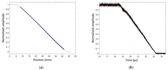 The first step was to calculate the CFBG response by integrating and normalizing the reference reflected optical spectrum (1). In practice, the minimum and maximum wavelength bounds are not obvious. Since the optical spectrum was measured using an OSA within a very high dynamic range (>50 dB), we set a threshold at −20 dB from the maximum reflectivity to determine the minimum and maximum wavelength bounds. The CFBG response as a function of wavelength is plotted in Figure 17a. The CFBG response as function of the position was obtained using the WPF. This curve was truncated at the upper and lower CFBG response limits (0.05–0.95) and then plotted, as shown in Figure 17b.