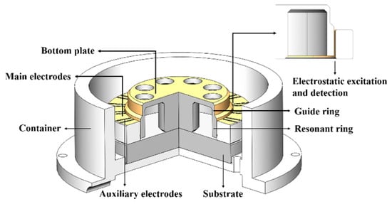 In this research, a fused silica cylindrical resonator with a high Q factor was fabricated in the same way as stated in []. The sectional view of the resonator with electrodes is shown in Figure 1. The resonator has three main components, the resonant ring, the guide ring, and the bottom plate. The resonant ring has the maximum amplitude and is used for electrostatic excitation and detection, the guide ring is used for vibration transfer, and the bottom plate is used for support. The outer surface of the resonator was coated with Cr/Au (~20/60 nm) film by magnetron sputtering and the resonator was rigidly connected with a fused silica base through its supporting rod. A fused silica cylindrical ring with laser-cut electrodes was attached on the base outside the resonator with a gap of approximately 16 μm. The main electrodes were used to excite or detect resonator vibration, while the auxiliary electrodes were grounded to reduce signal interference. The assembly was vacuum packaged with a pressure of 10−4 Pa with getter. During the experiment, the whole package was placed in a temperature-controlled chamber.