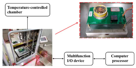 The outside metal film of the resonator and the main electrodes formed parallel plate capacitors used to excite or detect the vibration of the resonator from different directions. The constructions of electrostatic excitation and detection for fused silica resonators have been described in detail in [,]. Using a multifunctional I/O device, the actuating capacitors were connected to applied voltage sources. Excitation signals were generated by the multifunction I/O device with the controlled program designed and operated in the LabVIEW software, and all the relative parameters could be easily adjusted according to the actual conditions. Detection signals from sensing capacitors were collected by the multifunctional I/O device and processed by the LabVIEW program, as shown in Figure 2.