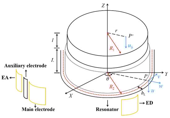 where L, l are respectively the height of the resonant ring and the guide ring of the resonator, R1 and R2 are respectively the radiuses of middle surfaces of the guide ring and the resonant ring, hdam is the depth of the damaged layer, E is the elastic modulus, and is the thermal expansion coefficient. The characteristic time t is introduced by Zener [] as “relaxation time” to describe anelasticity in solids, and is derived as , where is the typical size of heat distribution [], is the thermal conductivity coefficient, and c is the heat capacity.