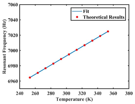 Table 1 presents some mechanical and thermal properties of fused silica used for the following numerical calculations, and the effects of temperature on elastic modulus, E, and Poisson’s ratio, , of fused silica are depicted in [,]. At the temperature range from 253.15 K to 353.15 K, the elastic modulus and the Poisson’s ratio both vary linearly with temperature as in and [,], and other properties were considered as constants in this study. Table 2 presents the geometry parameters of the resonator. With these parameters, we can calculate the changes of specific vibrational characteristics with temperature according to the theoretical analysis in Section 3.1. According to Equation (5), numerical results show that the fitted value of resonant frequency is , and the goodness of fit of the fitting curve is 1, as shown in Figure 4. Meanwhile, according to Equation (7), the approximation of resonant frequency is and the relative difference of the gradient is 0.25%, which indicates the reliability of the approximation.