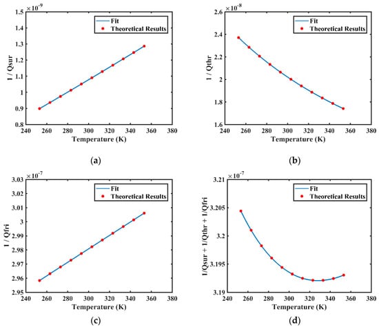 Numerical calculations of different types of damping loss varying with temperature at the temperature range from 253.15 K to 353.15 K: (a) the surface-loss correlated 1/Qsur varies with temperature; (b) the thermoelastic-damping correlated 1/Qthr varies with temperature; (c) the internal-friction correlated 1/Qfri varies with temperature; (d) the sum of 1/Qsur, 1/Qthr, and 1/Qfri varies with temperature.