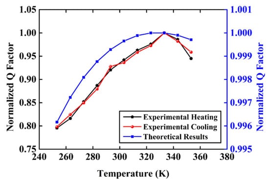 The measured and theoretical normalized Q factor varying with temperature at the temperature range from 253.15 K to 353.15 K.