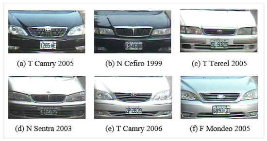 Vehicle make and model (VMM) identification methods fall into three main categories in the literature: feature-based, appearance-based and model-based methods. Feature-based methods identify vehicle models based on global or local invariant features. Hence, their performance depends on the reliability of features. For VMM, these have included symmetrical sped up robust features (SURF) [], edge map [], sparse representation [] and probabilistic feature grouping []. Hsieh et al. [] proposed a VMMR system using HOG and symmetrical SURF. Kumar et al. [] detected vehicle logos by combining appearance-based and feature-based methods, and then using an SVM classifier to classify vehicles into four categories. Appearance-based methods classify vehicles by their inherent features containing shapes [], symmetry [], textures and dimensions []. Variation in the pose or change in the position of a camera can reduce the performances of those methods wherein the pose of vehicles is estimated using shape features, as in [], but the authors do not discuss occlusion, lighting changes or viewpoint changes. Model-based recognition of vehicles includes the adaptive model [], the approximate model [] and the 3D model [,]. In [], to classify vehicles, a 3D shape deformable vehicle model is used to detect different vehicle parts and then to recover shape information.