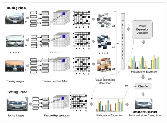 The summary of the proposed VMMR approach is presented in Figure 4. In the training phase, features are first extracted from labeled images with specific vehicle class labels as , where j is the total number of vehicle classes. During the next phase, a visual expression codebook is generated by defining visual words. A histogram of expressions is generated by counting the occurrences of every expression for the training images of a vehicle. Finally, a BoE-based representation of training images is applied for the training of a supervised classifier. During the testing phase, a feature representation is acquired for unlabeled vehicle images and quantized using a codebook of a visual expression generated in the training phase. Then, occurrences of each expression are added to build a histogram of expressions which is then passed to the trained classifier to detect the vehicle label. A more detailed explanation of these processes is given in the following subsections.