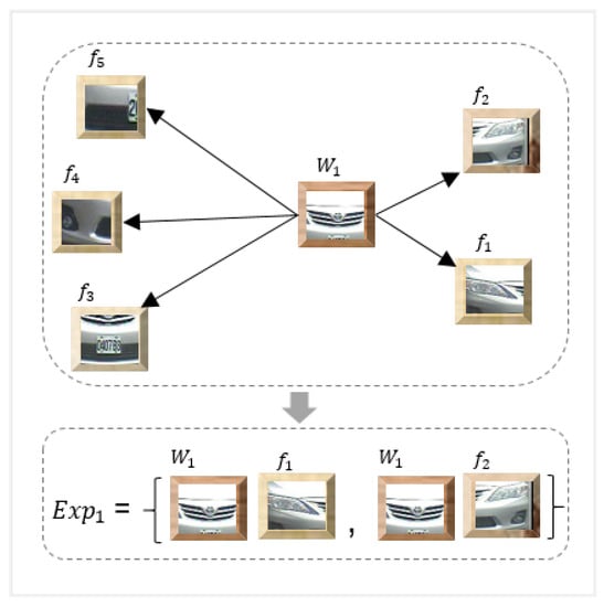 For a given set of vehicle classes, the aim is to learn a global representation for the vehicle classes by means of singular dictionary generation. The obtained features are characterized as follows: where j represents the number of vehicle classes. The clusters are formed by applying the widely used k-means clustering algorithm [] on the obtained features, and distinctive visual words are obtained for all the vehicle classes. The centroids obtained by k-means represent the visual words which are denoted by W. The visual vocabulary is represented as where W is a complete set of visual words for all the vehicle classes and n represents a total number of visual words. Each visual word from W is paired with its N nearest neighbors and forms an expression representation , as shown in Figure 6.