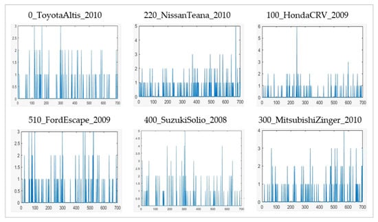 Different types of feature point detectors are applied to detect the unique feature points from each class of vehicle, as shown in Figure 5. In this work, the KAZE feature detector [] has been used to detect feature points of interest from vehicle images. To detect the points of interest, the results of the scale-normalized determinant of the Hessian were calculated at different numbers of scale levels.