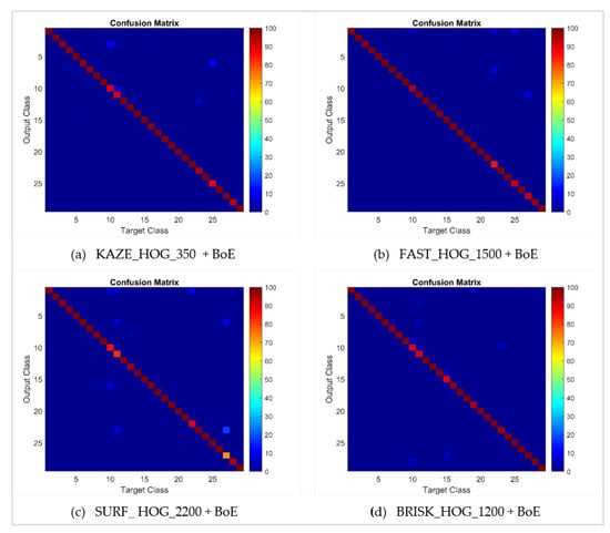 Different combinations of distance measure and coding design model were evaluated with KAZE HOG, FAST HOG, BRISK HOG and SURF HOG, as presented in Table 4. In the case of KAZE HOG ( dictionary size = 350), the highest average accuracy (98.27%) was obtained with one-vs.-all and Mahalanobis, but processing speed was worse compared to the sparse-random and Mahalanobis combination. The same descriptor with all-pairs results in less accuracy as well as slower processing speed compared to other combinations. Its best result (best trade-off between speed and accuracy) is 98.22% average accuracy using sparse-random and Mahalanobis combination. FAST HOG (dictionary size = 1500), with one-vs.-all and euclidean results in the highest average accuracy (98.36%), but it is computationally slow compared to sparse-random. The best trade-off results (98.33%) are obtained using a combination of sparse-random and Mahalanobis with dictionary size 1500. For SURF HOG feature descriptor (dictionary size = 2200), its highest accuracy is 97.32%, using euclidean and sparse-random, but at the expense of computational speed. The best trade-off performance is achieved using a sparse-random and Mahalanobis distance combination, reaching 97.24%. BRISK HOG (dictionary size = 1200), reaches its highest average accuracy at 98.49% using one-vs.-all and Mahalanobis, but again sacrificing speed. Its best trade-off result is 98.43% using Mahalanobis and sparse-random combination. The average per-class accuracies of the proposed approaches on the NTOU-MMR dataset are presented in Table 5, which illustrates the class-wise dominance of the proposed approaches on NTOU-MMR dataset.