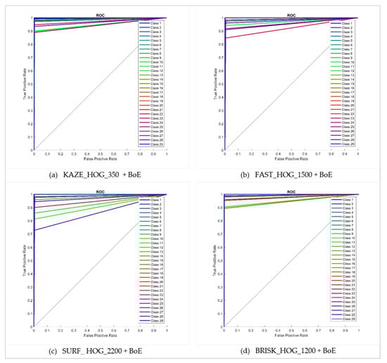 The performance of the approach presented here is also illustrated by means of confusion matrices and ROC curves, as shown in Figure 10 and Figure 11 respectively. The problem of multiplicity, as discussed in Figure 1, was resolved by applying the proposed approaches. For example, C4 had a multiplicity problem that did not degrade the results, as can be seen in Table 5. The multiplicity problem in C11 (Honda CRV) did not significantly affect the FAST HOG-based BOE approach. However, KAZE, SURF and BRISK degrade somewhat to 90.4%, 82.4% and 89.6% average accuracy. The inter-make ambiguity problems between C2 and C18; C9 and C17; and C2 and C28, as shown in Figure 3, were also addressed. The intra-make ambiguity problems between C17 and C18; C1 and C2; and C1 and C2, as shown in Figure 2, were also overcome. The results for all these ambiguous classes show good performance, as can be seen in Table 5. Furthermore, these good performance indicators show that the proposed approach is able to cope well with many of the challenges in this dataset (as illustrated by Figure 8).