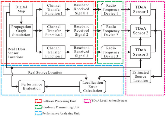 The block diagram of the proposed performance-evaluation approach for a time difference of arrival (TDoA) localization system.