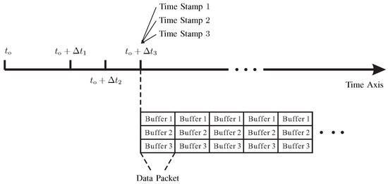 - The data samples are temporarily copied into the memory buffers. A time stamp is built for the data in each buffer, i.e., “Time Stamp 1”, “Time Stamp 2” and “Time Stamp 3” in Figure 4, in order to determine the exact time instant at which the transmission starts. Then a data packet is constructed including all the buffers.