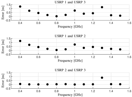 The time differences between arbitrarily two of the three USRPs are illustrated versus a frequency range from to GHz with GHz spacing. Note that the sampling rate of the oscilloscope is 10 GSa/s. Hence, the resolution for the synchronization error can be calculated as the inverse of the sampling rate, i.e., ns.