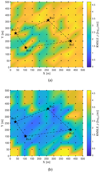Two algorithms respectively using Spherical-Intersecting [46] and Levenberg–Marquart [47] techniques are implemented utilizing the CIRs obtained from the propagation graph as the input of the TDoA information. Let us denote the two algorithms as “Algorithm A” and “Algorithm B”, respectively. Specifically, in each simulated CIR for the link between a source and a sensor, the propagation delay of the path with the maximum power gain is obtained, and then the TDoA for each pair of links between the source and two sensors is attained subtracting one corresponding delay from another. For Algorithm B, the initial guess of source location for all the candidates in the area is obtained averaging each coordinate component of all the four sensor locations. Figure 7 illustrates the comparison of the RMSLE heat maps between the two algorithms.