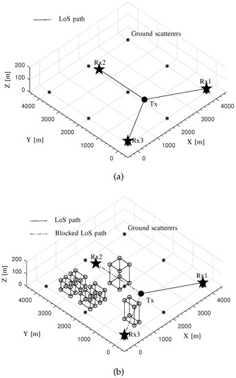 For these two scenarios, we only consider LoS paths from transmitters to receivers and DS paths in the propagation graph simulation. In Figure 8a, an LoS path exists between the source and each sensor. In Figure 8b, the LoS paths between Tx and Rx2 as well as between Tx and Rx3 were blocked by the objects while the LoS path between Tx and Rx1 was still unobstructed. Moreover, some objects are placed beside Rx2 and Rx3. The signals transmitted from Tx are likely to arrive at Rx2 and Rx3 along the DS paths. For the propagation graph simulation here, the scattering loss coefficients S for smooth and rough surfaces were set as and , respectively. The parameter was set as and m for smooth and rough surfaces, respectively. The localization system was tested with three BWs, i.e., 5, 25, 3125 KHz, as well as four SNRs, i.e., , 8, 17, 30 dB. The carrier frequency is set as 1 GHz.