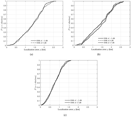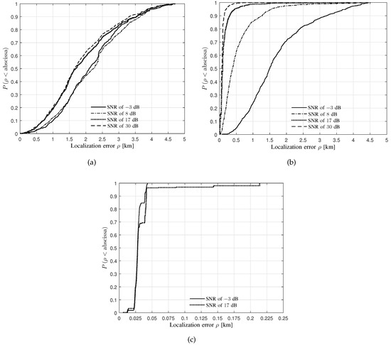 - It can be observed from Figure 9b that the median localization error increases with the SNR decreasing.