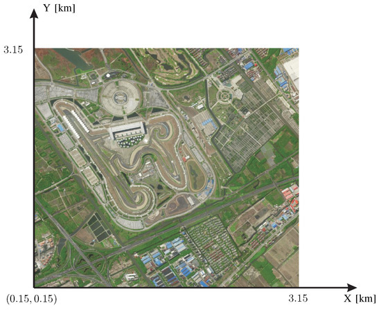 Totally three types of sensor placement are configured for the verification here. The carrier frequency, the transmitted signal BW, the number of frequency points and the SNR are set as 1 GHz, 250 KHz, 100 and 20 dB, respectively. Figure 11 shows the satellite map of a realistic 3 km × 3 km area of an automobile circuit.