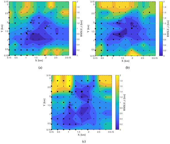 In Figure 12, the dot size for a source is set the largest if an LoS path exists between the source and each sensor while the smallest if no LoS paths exist. In most cases here, zero or one LoS path exists between the source and all the sensors for the three types of sensor placement. Based on these results, the second type of sensor placement can be selected if one would like to obtain the lowest RMSLE in the area enclosed by the three sensors.