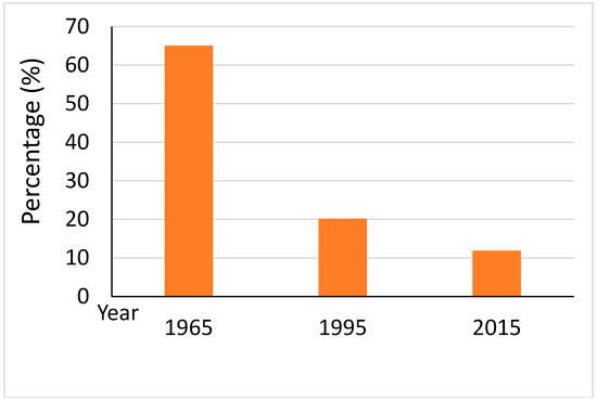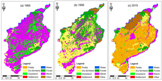 Figure 3 demonstrates the area percentage of marsh in the SSP during 1965–2015. Statistical data indicate that the area percentage of marsh decreased from 65.07% in 1965 to 11.90% in 2015, with a drastic drop of 53.17% during the study period. The marsh area in the SSP declined drastically during period 1 (1965–1995) and then decreased slightly during period 2 (1995–2015). Figure 4 demonstrates the spatial changes of land-use in the SSP. It can be clearly seen from Figure 4 that the marsh was reclaimed as cultivated land on a large scale.
