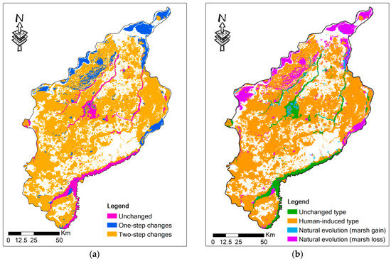 To distinguish the role of human activities and natural factors, we assumed that marsh changes are human-induced types, provided that one of the observed land-use changes is human-induced, whenever it occurs. Our hypothesis may have some uncertainties to some extent, but it provides a preliminary estimation of the effects of human disturbance on marsh loss. Firstly, once a marsh is destroyed by human beings, it tends to stay stable. For example, once a marsh is converted to cultivated land and settlement, it usually maintains a stable status [24]. Secondly, the proportion of marsh changes caused by human disturbances in period 1 and those induced by natural evolution in period 2 was small. As a result, the hypothesis in this study is relatively reasonable.