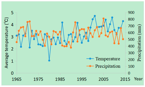Climate change was also an important factor that affected marsh changes in the study area. Climate warming has been observed since the 1950s in Northeast China, as well as in the Sanjiang Plain [18,47,48,49]. Studies indicate that the mean temperature has increased by approximately 0.78 °C per year in the Sanjiang Plain since 1954 [18]. The temperature and precipitation changes since 1965 in the Sanjiang Plain were obtained according to published climate data [18], which were generated by the Kriging interpolation of data from meteorological stations (Figure 6). The results indicate that the yearly average temperature increased by 0.28 °C/10 y, while precipitation decreased at a rate of 0.24 mm/year in the Sanjiang Plain in the past five decades.