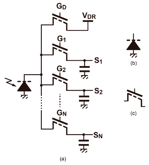 Indirect time-of-flight (TOF) range image sensors are increasingly demanded for various application areas. The application includes smart devices, augmented reality (AR)/virtual reality (VR) systems, security systems, drones, robots, slow vehicles, automated carriers, and automobiles. In order to expand the application areas of TOF imagers, improvements for depth resolution under aggressive conditions, such as longer distance and stronger ambient light, are necessary. Indirect TOF image sensors are classified into two types: a continuous-wave (CW) TOF method [1,2,3,4,5,6,7,8,9] and a short-pulse (SP) TOF method [10,11,12,13,14,15]. In CW-TOF imagers, the high depth resolution and longer distance measurements are simultaneously realized by using higher and multiple (2 or 3) modulation frequencies [5,8]. On the other hand, in the SP-TOF method, the depth resolution is improved by making the gating-time width shorter, and the distance is extended by increasing the number of signal taps of the pixel and by using range-shifting techniques [14,15,16]. For the outdoor use of TOF sensors, the SP-TOF method is more advantageous because a lower amount of ambient light charge is accumulated by using a small-duty, energy-concentrated light pulse and the short gating-time window of the pixel. This results in a high tolerance to the saturation of the pixel and less ambient light shot noise. In addition to this, the pulse-based method has a flexibility regarding the gating clock patterns to be programmed for having advanced functions and performances. Though the reported SP-TOF pixels have maximally four taps for signal outputs [14,15], a SP-TOF pixel with a further number of signal taps will create opportunities of indirect TOF imagers to be used for a variety of applications under aggressive operating conditions.