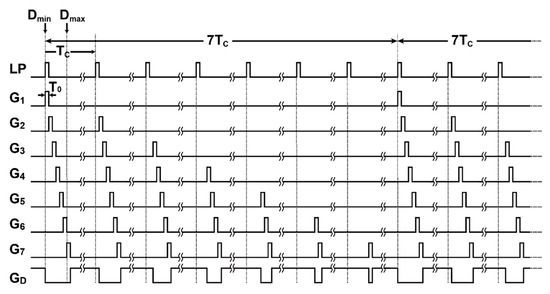 Figure 3 shows the SP-TOF measurement timing diagram for considering the dependency of the attenuated reflected light on the distance. In the operation shown in Figure 2b, the gating pulses from G1 through G7 are applied consecutively for the closest through to the farthest TOF measurements, respectively. Because of this, the gated signals for the closer objects tend to be too strong, while the gated signals for farther objects tend to be too weak to measure the TOF precisely. In Figure 3, with seven light-pulse cycles as a unit period, the number of gating times for G1 through G7 is gradually and adaptively increased into the distance: once per seven cycles for G1, twice per seven cycles for G2, and so on. With this operation, named the depth-adaptive time-gating-number assignment (DATA), the amount of signal charge at the farthest gated signal of G7 is maximized while avoiding the saturation in the closest gated signals of G1.