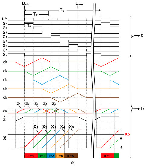 which responds linearly to from to , as shown in Figure 4, where n = 1, 2, 3, 4, or 5. If the light pulse is coming when the gates Gn+2 and Gn+1 are activated, the signal charges, qn+2 and qn+1 are generated. If there is an ambient light, qn+2 and qn+1 may also contain ambient light and qn contains an ambient light charge only. Therefore, Equation (1) describes the cancellation of ambient light charge. Because the light pulse and gating pulses are applied repeatedly with the cycle of , the behavior of d1 for the range of TF < 0 in Figure 4 is considered the same as that for the TOF of TC + TF, 2TC + TF, 3TC + TF, and so on. These five curves as a function of are used for measuring the TOF of the back-reflected light. To do this, the variables as a function of , i.e., (n = 1, 2, …, 5) shown in Figure 4, is defined as: