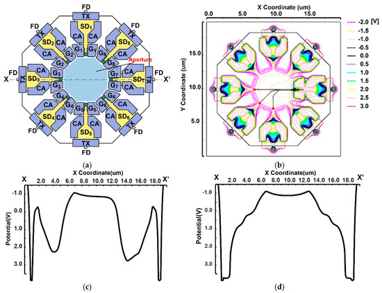Figure 5d shows the potential diagrams along with the X–X’ lines shown in Figure 5a when the accumulated carriers in the SD are transferred to the FD. In this case, the TX gates are biased to a high voltage (3.3 V) and the LEFM gates ( through ) and CA gates are biased to a low voltage (LEFM gate: −2 V, CA gate: −1 V). As can be seen from this result, the channel potentials around and are relatively low and these potentials prevent the charges from transferring to the untargeted SDs, while the CA gate creates a large potential gradient, which attracts carriers to be transferred to the FD.