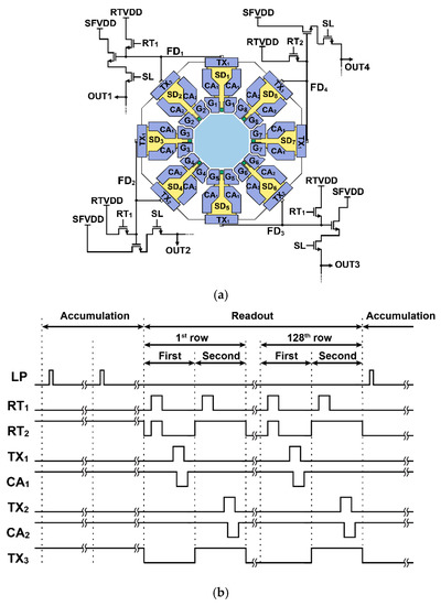 Figure 5a shows the structure (top view) of the designed 8-tap lock-in pixel. A pinned photodiode (PPD) as a photo detector is located in the central region, and the flow of photo-charges to eight directions is controlled by eight modulation gates concentrically placed around the PPD. The modulation gates ( through ) are implemented using a lateral electric field charge modulation (LEFM) [19]. The modulated charge at each tap is stored in a storage diode (SD) [20,21]. The SD basically has a structure of a pinned diode, and while having a sufficient amount of full-well capacitance (FWC) and helping the charge transfer from the SD to the floating diffusion (FD), a charge-transfer assisting (CA) gate is used for each tap [17]. During the charge transfer from the PPD to the SD, the potential well voltage of the SD is raised by the CA gate being biased to a high voltage (2.3 V). When reading the charge by transferring the accumulated charge in the SD to the FD by the transfer (TX) gate, the potential well depth of the SD is lowered by the CA gate to be biased to a low voltage (−1.0 V). This operation assists in transferring the charge from the SD to the FD while preventing backward charge retransfer from the FD to the SD.