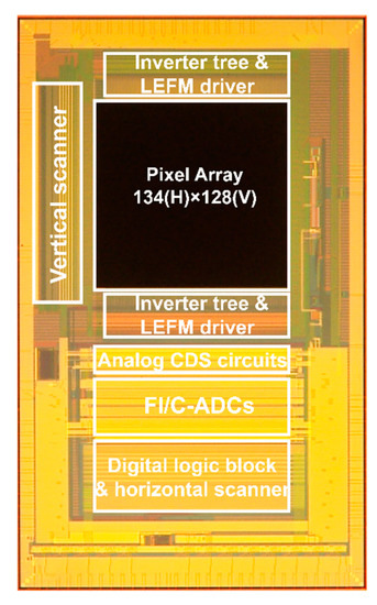 Chip micrograph. CDS: correlated double sampling, FI/C-ADC: Folding-Integration/Cyclic ADC, LEFM: lateral electric field charge modulation.