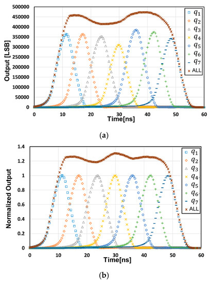Response of the seven signal-tap outputs to the light pulse delay: (a) measured raw data and (b) the normalized data.