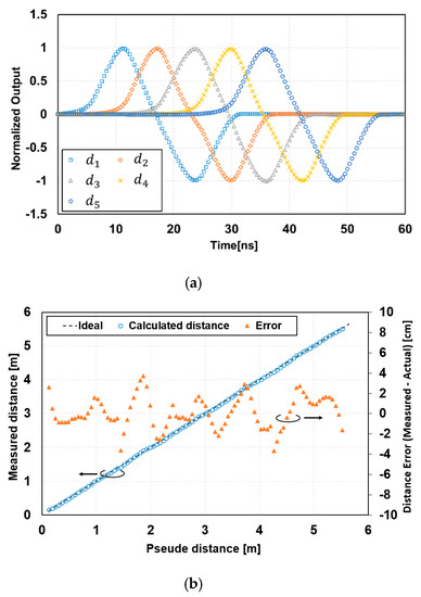 Figure 8 shows a measurement result of the response of seven signal-tap outputs to the light pulse delay. A laser pulse with a pulse width of 6 ns, a wavelength of 850 nm, a power of 29 mW/m2 (0.88 W/m2 peak) at 6 m and a laser pulse rate of 5.5 MHz was used. A lens with a large focal length of 12.5 mm was used For the sensor characterization, the sensor field-of-view (FOV) used for the measurement was 13.1°(V) × 13.7°(H). In this measurement, the modulation gates, G1 through G7, were opened as shown in the timing of Figure 2b with T0 = 6 ns, and the delay of the laser pulse was scanned from 0 to 60 ns with a step of 0.4 ns. The gate G8 was used as a charge draining gate and the was working as a drain. Figure 8a shows measured data after subtracting the dark signal from the raw data and Figure 8b shows a normalized result with a sensitivity correction. The average demodulation contrast in the charge signals stored in SDs, for through , was 0.83. As shown in Figure 8, the response of the seven signals to the pulse delay time was fast enough for the short-pulse TOF measurement with the light pulse width of 6 ns when compared with the ideal response (triangular shape), where it was rising linearly over 6 ns and falling linearly over 6 ns. Using the normalized response of Figure 8b, the differences of the two signal-tap outputs (, , , ,) were calculated and are shown in Figure 9a. The five piecewise-linear response curves, two of which overlap each other, were obtained and these were used for the TOF range measurements by switching these five curves properly, as described in Section 2.3. Figure 9b shows a curve for the calculated (measured) distance, i.e., the pseudo distance, which corresponded to twice the TOF. This linearity plot was obtained using a calibration applying the gain and offset corrections to the five piecewise-linear response curves. After this non-linearity correction, the maximum of the measured distance error was 3.7 cm and the maximum non-linearity error was 0.67%FS in the range of 0 m to 5.4 m.