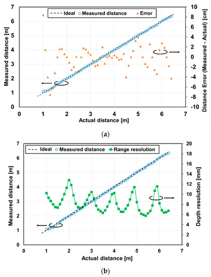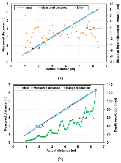 Measured distance versus real distance with an SP-TOF-specific timing: (a) non-linearity error and measured distance, and (b) depth resolution and measured distance.