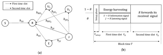 Assumption (v) is explained as the follows. Each legitimate node and J establish a shared secret key, i.e., , using CSI-based key generation method [24]. Then J broadcasts two combined keys and . Using their own key, all legitimate nodes can discover all secret keys while E cannot do that due to lack of global CSI; hence, only legitimate nodes can eliminate the jamming signal on their received signals. Let denote the duration for the setup phase consuming for channel estimation and secret key generation. The remain of block time T is separated into two equal time slots, , (illustrated in Figure 1b) and the communication during each time slot is described in Section 2.3 and Section 2.4.
