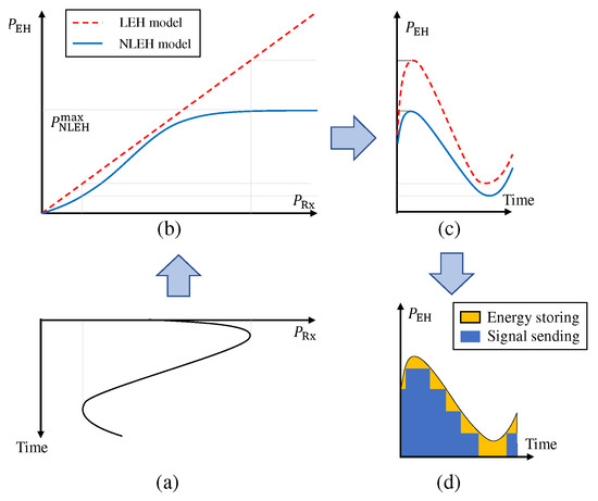 (a) The received power at the harvester, (b) the LEH and NLEH models, (c) the harvested energy and (d) the SaT scheme with NLEH.